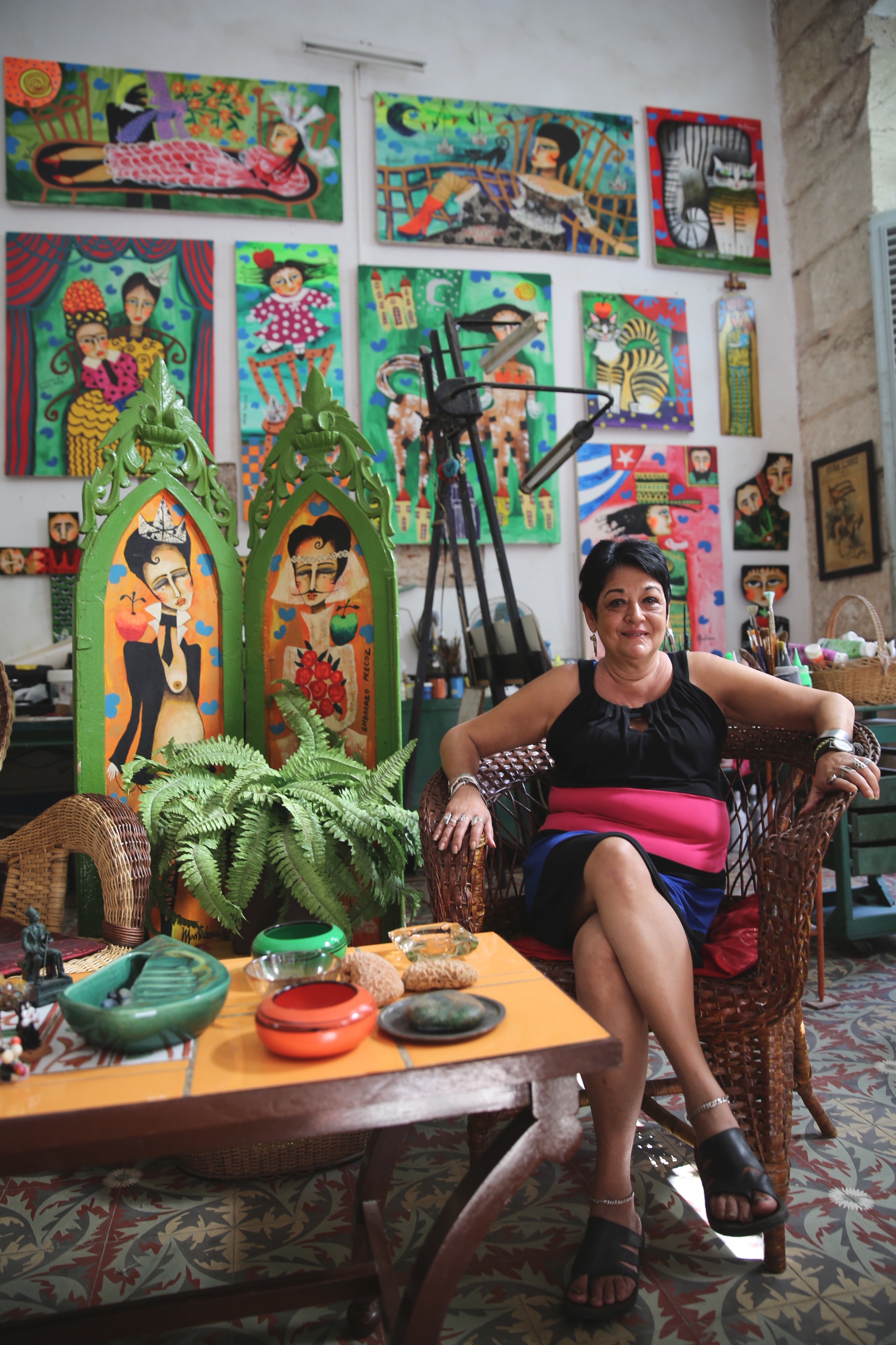 [aesop_content color=”#FFFFFF” background=”auto” columns=”2″ position=”none” imgrepeat=”no-repeat” floaterposition=”left” floaterdirection=”up”]While having breakfast another traveler from abroad told us about a place around the corner where we could go to take salsa lessons. It seems the best information just merely fell into our hands during this trip. So after a lovely breakfast we headed around the corner to Neptuno St to Casa del Tango and signed up for Salsa lessons for later that day. The cost was 15 CUCS per person and we each paid half upfront, the other half we’d pay at the end of our lesson. Then we hitched a ride in a classic vintage car to the Museum de Revolution for 5 CUCs (the smallest amount we’d paid during the trip for a cab). We were able to finally get out of our neighborhood and see more of Cuba. The area leading to the Museum is much more touristy with large hotels and groups of walking tours. The line was very long for the museum so we decidedto explore this area of Cuba instead, walking through the maze of colorful building that were a lot more in tact than in our neighborhood. This area is known as Habana Vieja and it was beautiful. We stumbled upon the art district where many artists were showing their paintings from their homes which doubled as their galleries. I was drawn into the home of Martalena. The artist was there sitting in a chair as I walked around her home admiring the 100’s of colorful and whimsical paintings she’d done. She often painted herself with short curly hair into the paintings. Langré noted that her paintings had a child like quality that lacked the attitude of perfection. I loved her work. We also checked out 2 other artists studios before heading to Bar La Floridita for much needed margaritas.