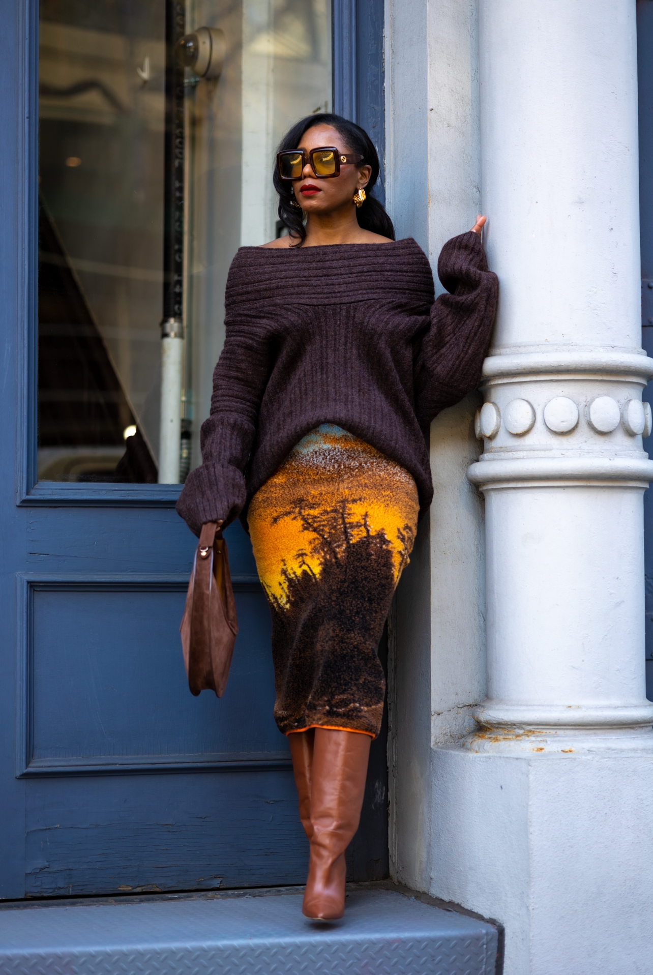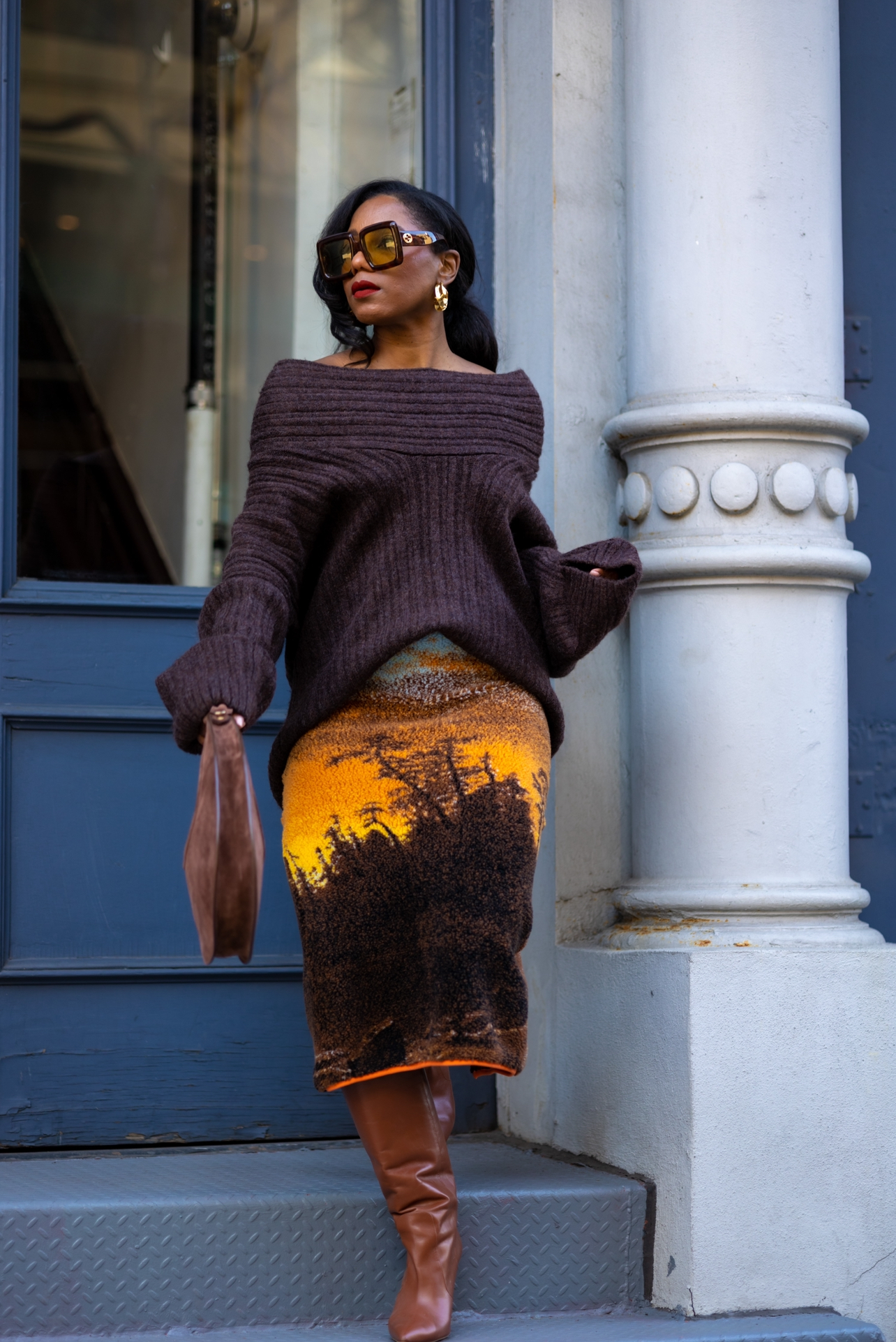 Source Unknown Sweater | Conner Ives Skirt SOLD OUT | Stuart Weitzman Parton Boots | Maison Eli Bag | Gucci Sunglasses | Oscar De La Renta Earrings