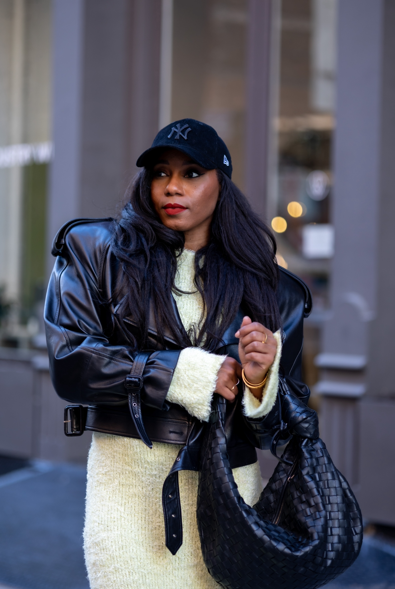 Lapointe Dress | YSL Jacket | NY Yankee Hat | Vetements Boots SOLD OUT | Bottega Bag
