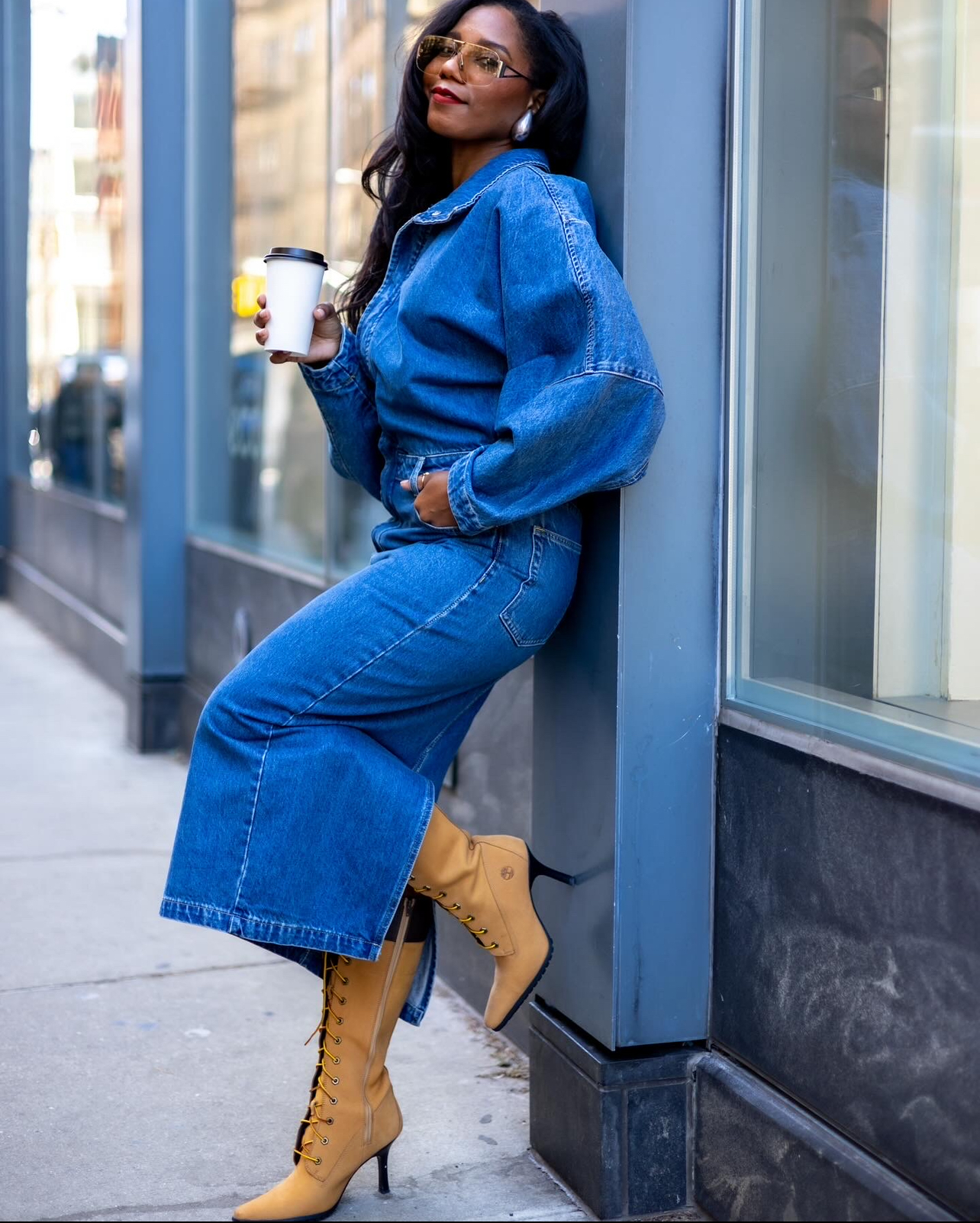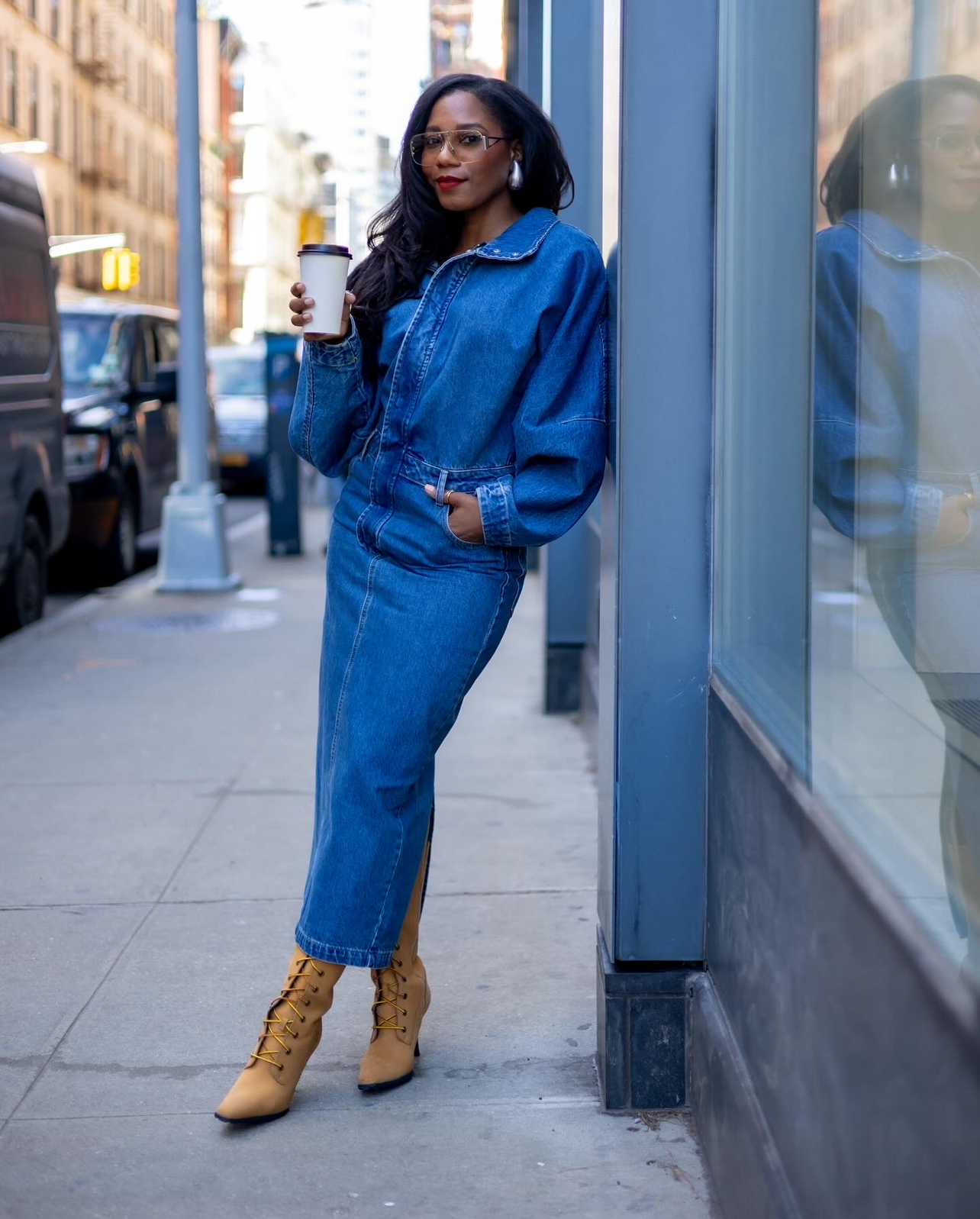 Ronny Kobo Denim Dress (Size Large this dress runs small) | Timberland x Veneta Carter Boots | Bottega Sunglasses | Bottega Earrings