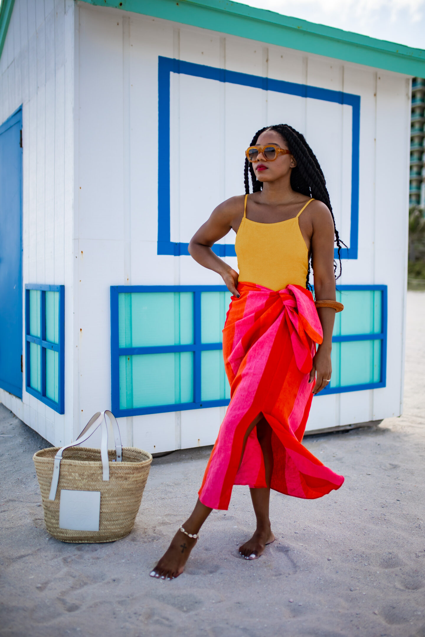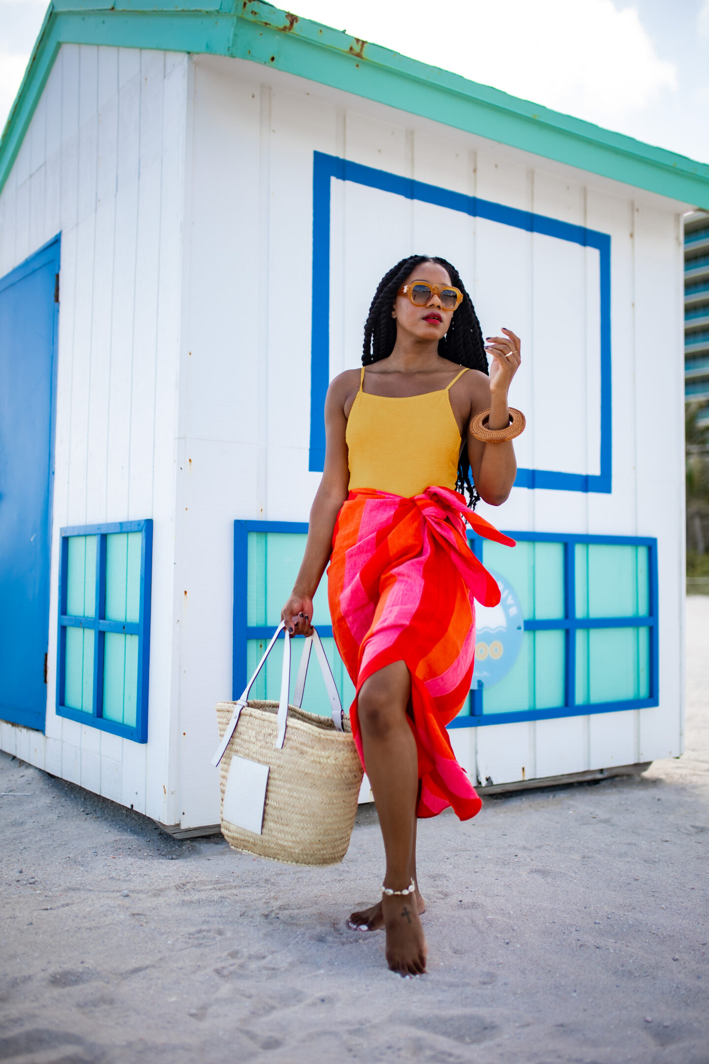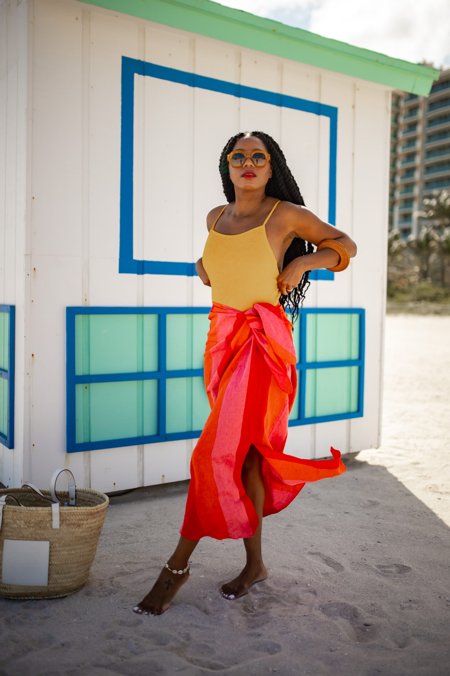 Mara Hoffman Wrap Skirt/Dress SOLD OUT| Yellow Crinkle Swimsuit | Lapima Sunglasses | Loewe Bag